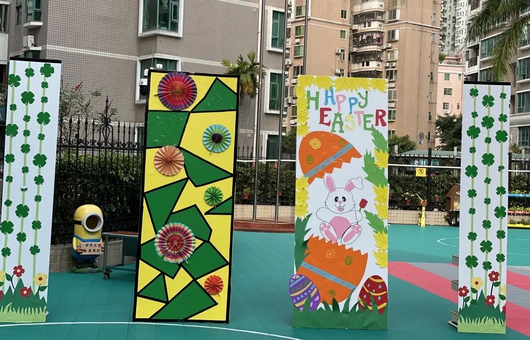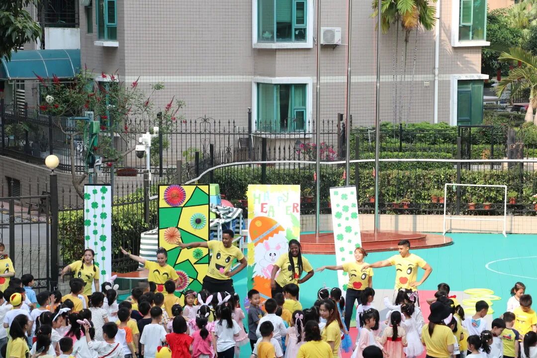 在这欢乐,缤纷,喜悦的节日了,当然少不了有趣的互动游戏了。外教老师们在操场和孩子一起唱跳复活节律动,一起进行有复活节的特色户外游戏。看!孩子们玩得多么欢乐!
